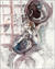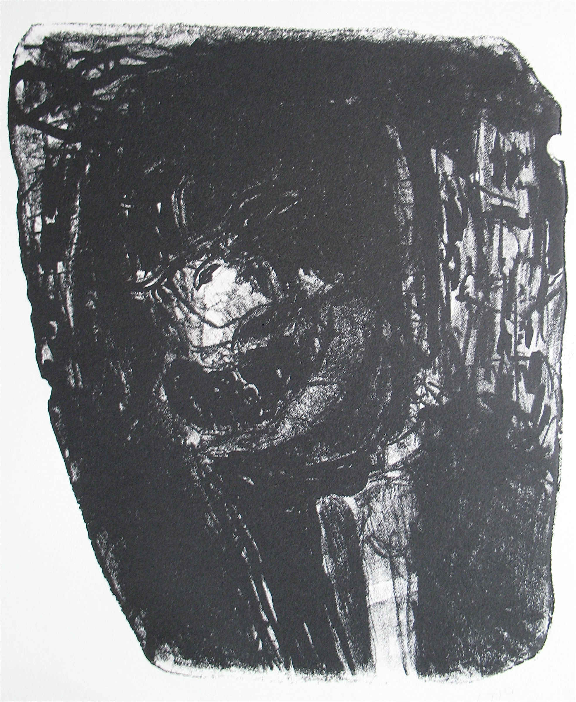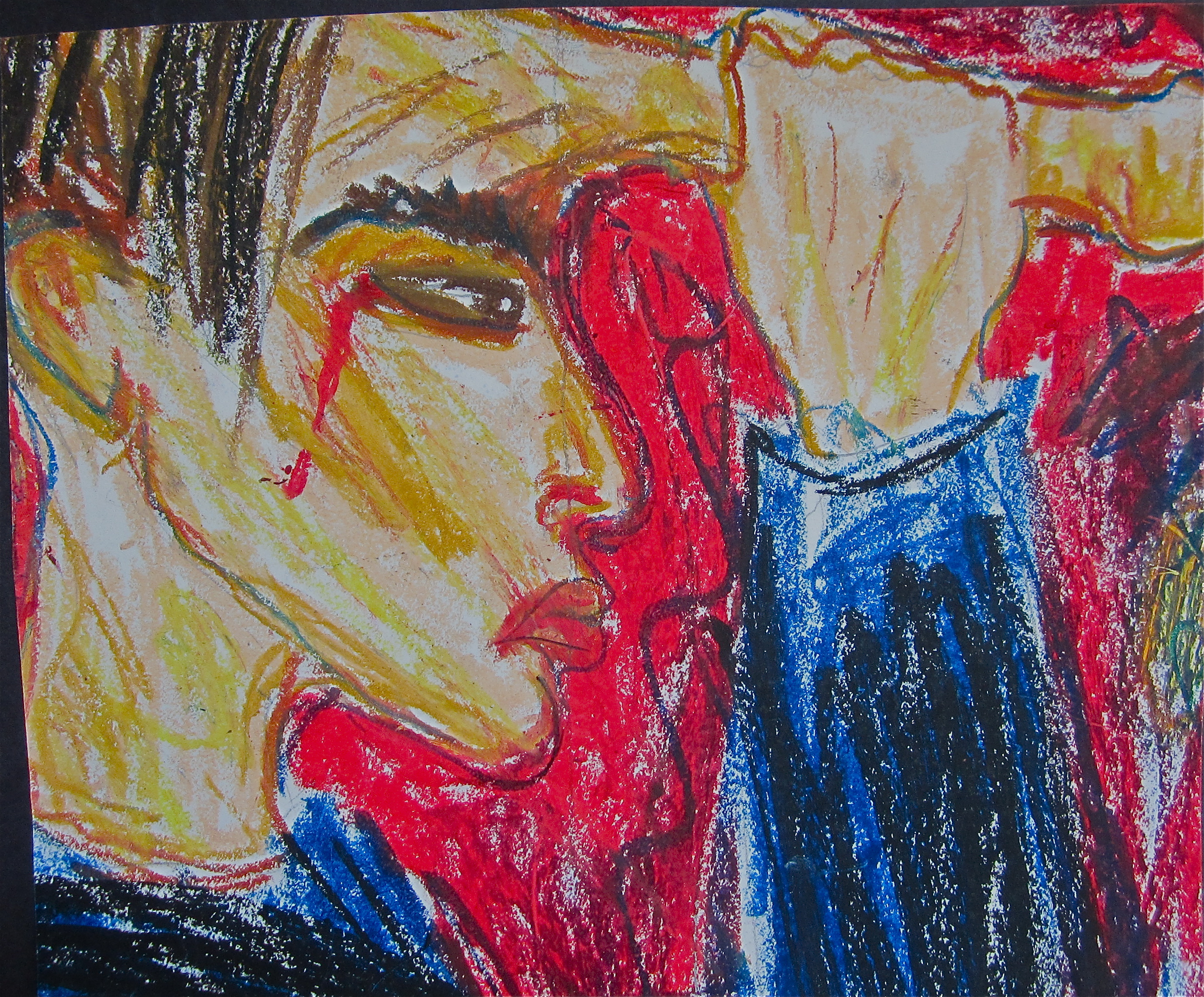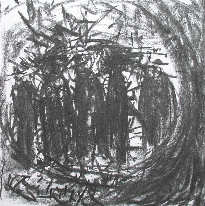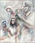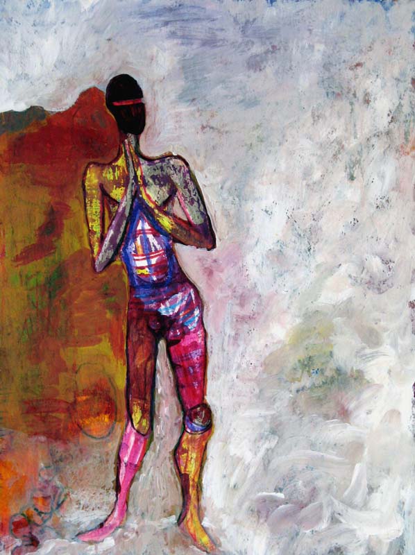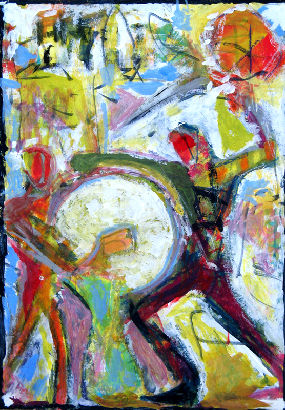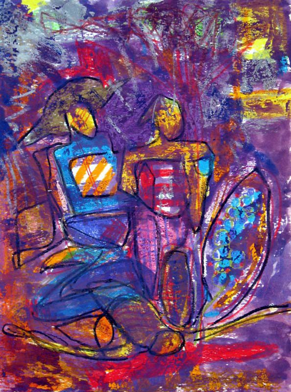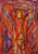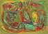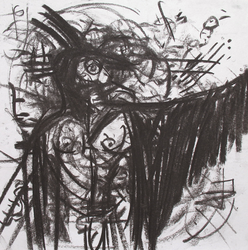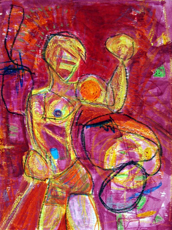 I often begin a piece by drawing “blind” with white crayon on white paper, then let the application of paint reveal content and guide me as I work up the rest of the picture.