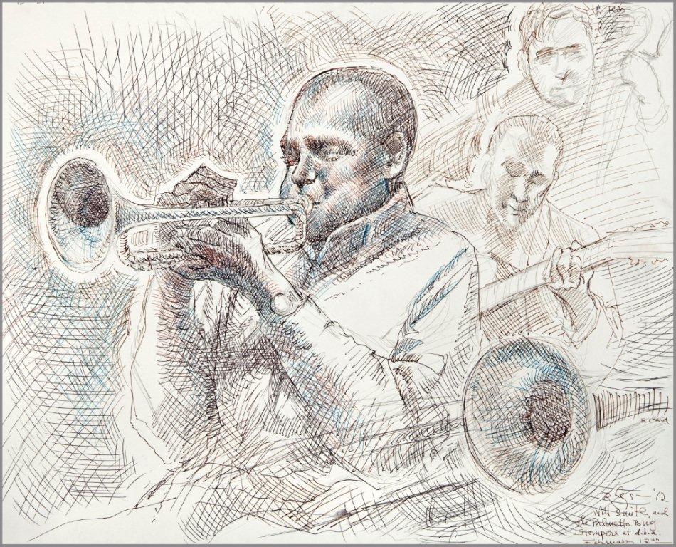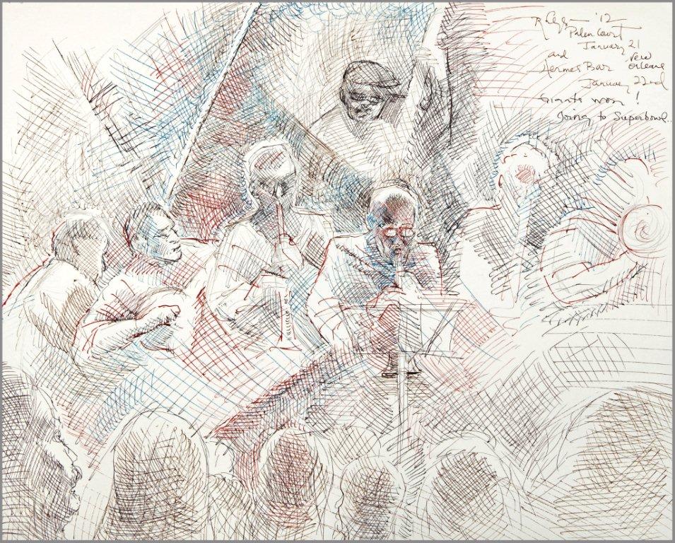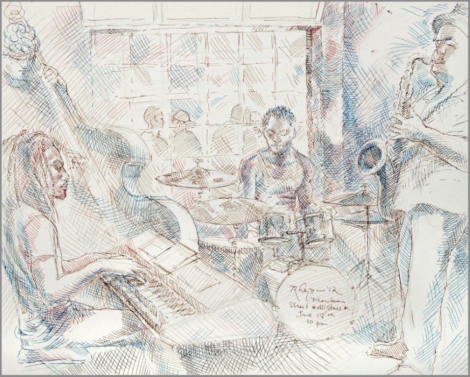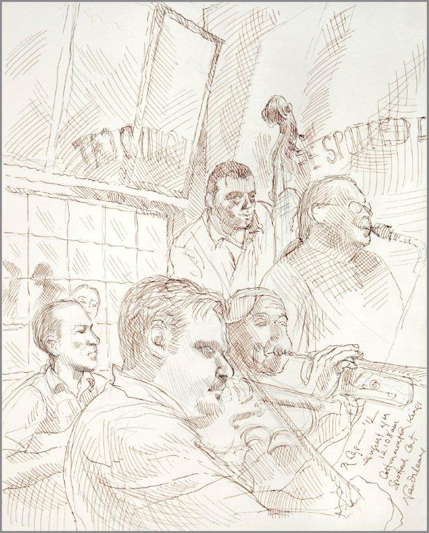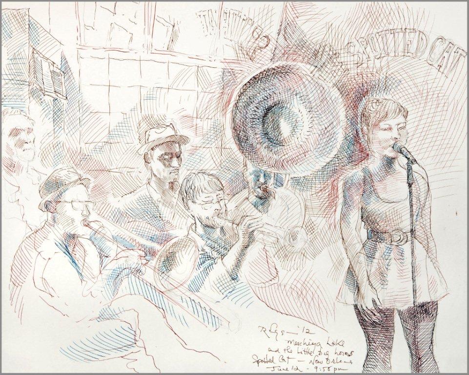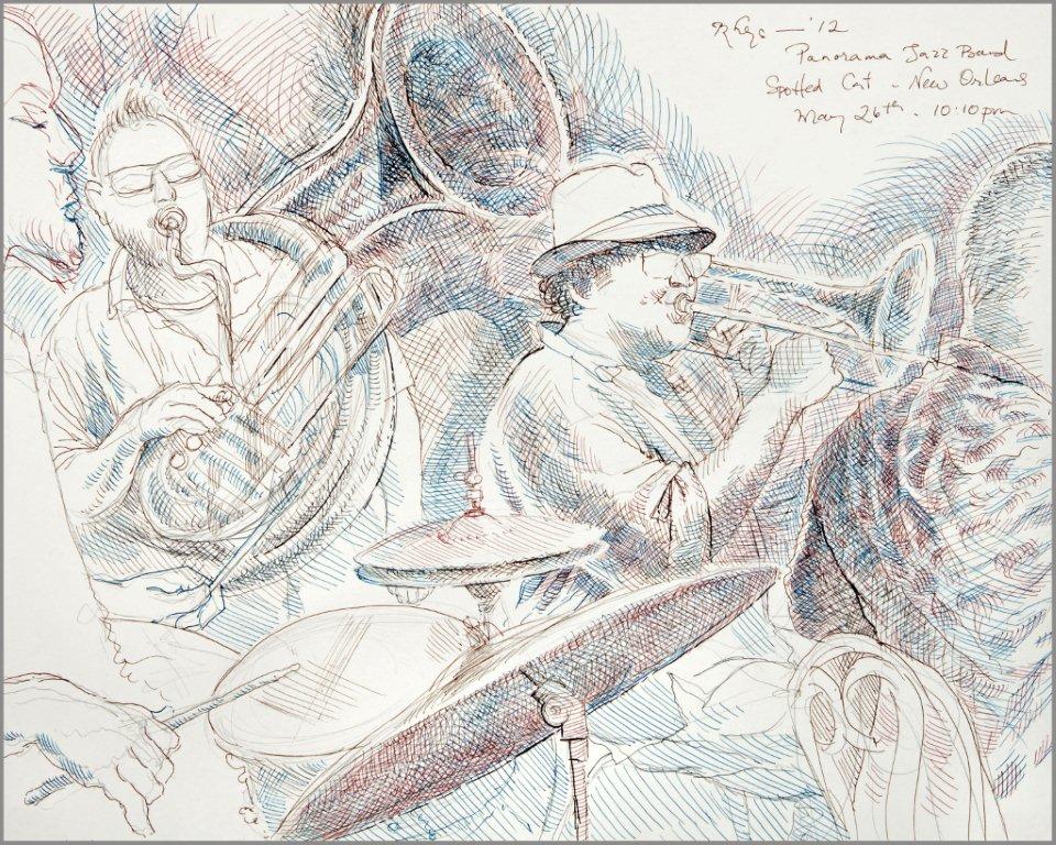 Emilie, a third-generation painter, is the daughter of Noel Rockmore (sometimes referred to as the Picasso of New Orleans). Rockmore is well known, for painting more than 800 portraits of the musicians of Preservation Jazz Hall. Emilie has been painting for more than 30 years, and now regularly sketches the musicians working in New Orleans today. She was always a painter first, but in the past two years, drawing has taken precedence and, happily, a sketchpad is well suited to the environment of music clubs.