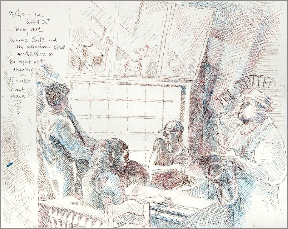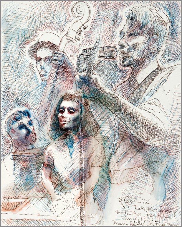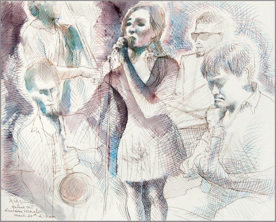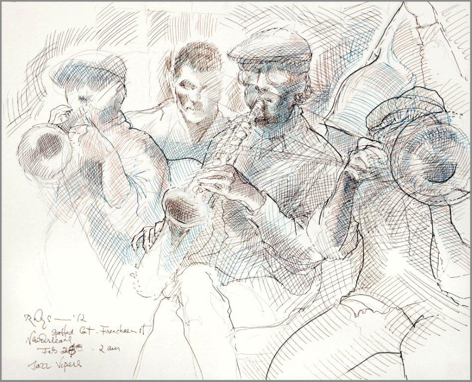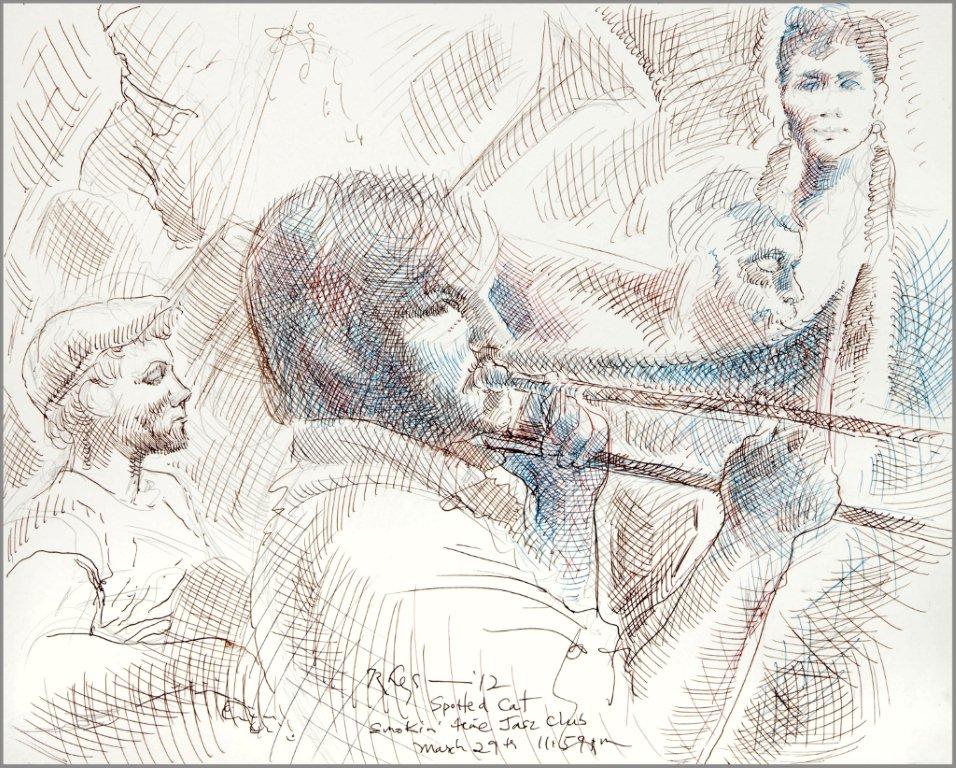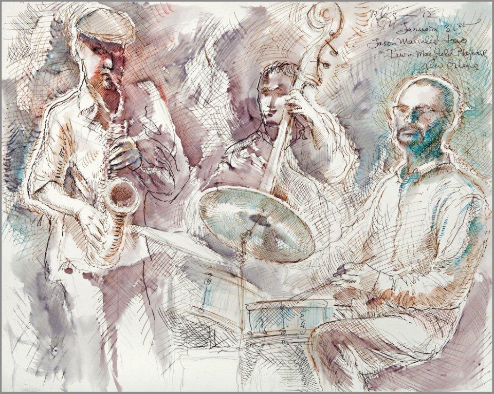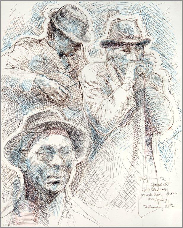 Emilie, a third-generation painter, is the daughter of Noel Rockmore (sometimes referred to as the Picasso of New Orleans). Rockmore is well known, for painting more than 800 portraits of the musicians of Preservation Jazz Hall. Emilie has been painting for more than 30 years, and now regularly sketches the musicians working in New Orleans today. She was always a painter first, but in the past two years, drawing has taken precedence and, happily, a sketchpad is well suited to the environment of music clubs.