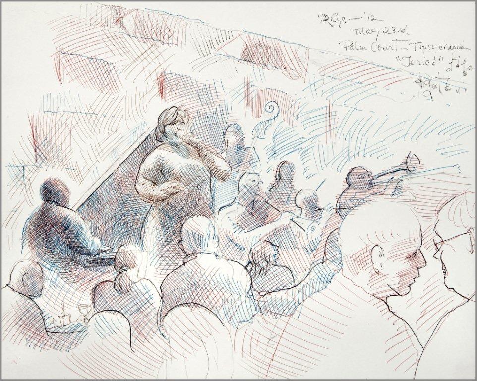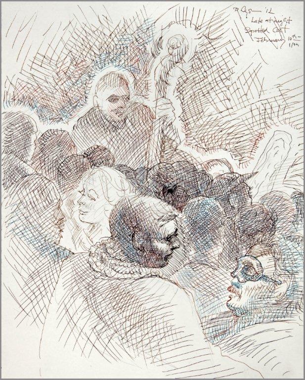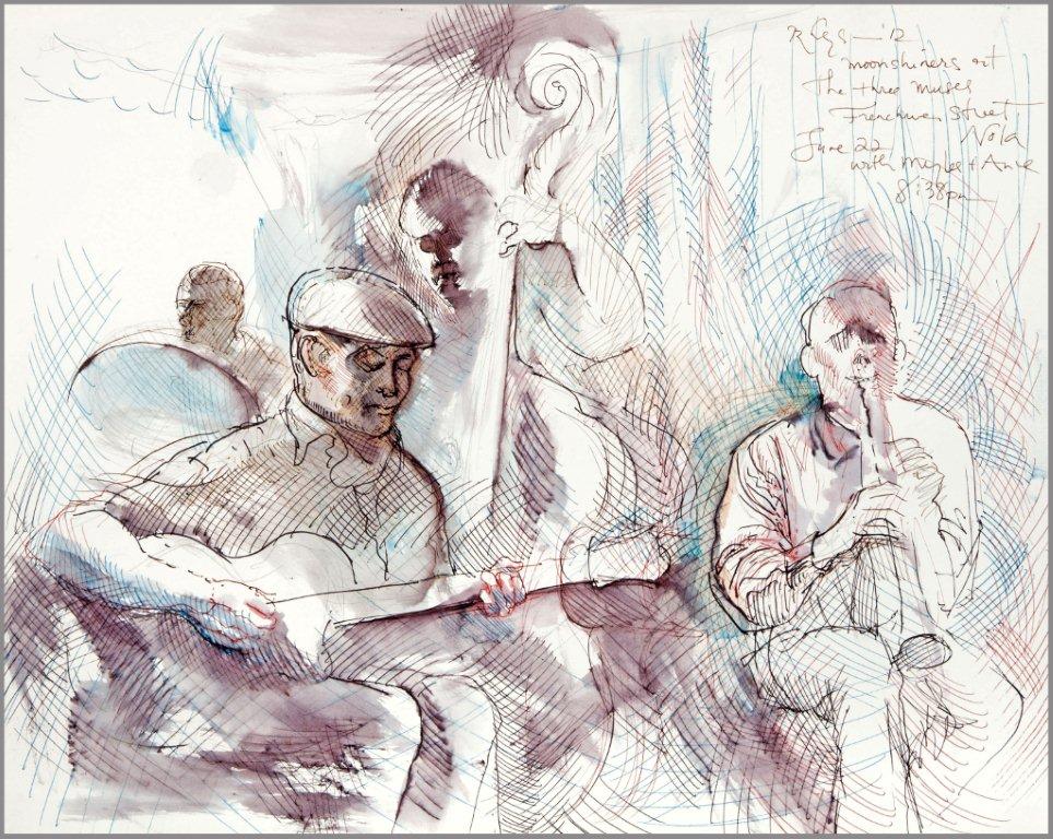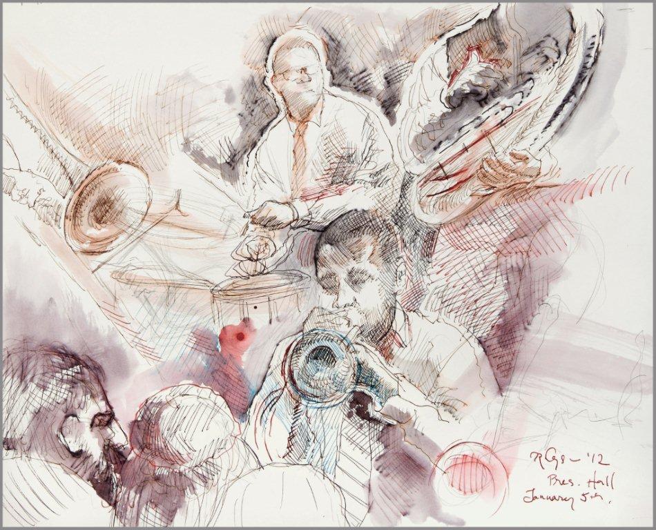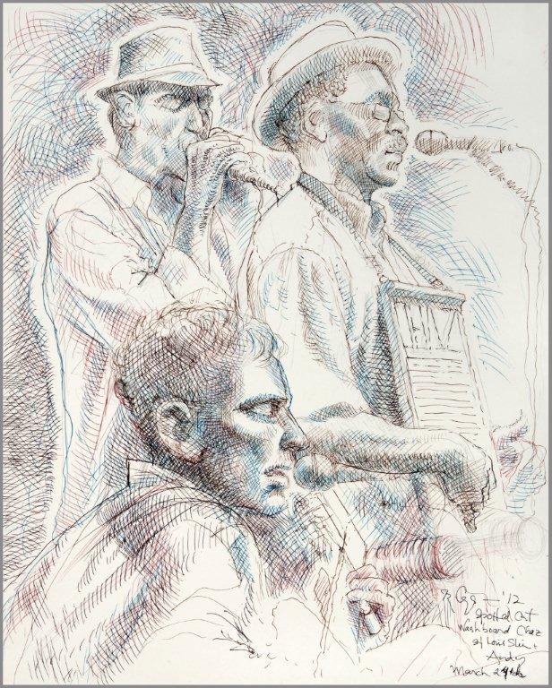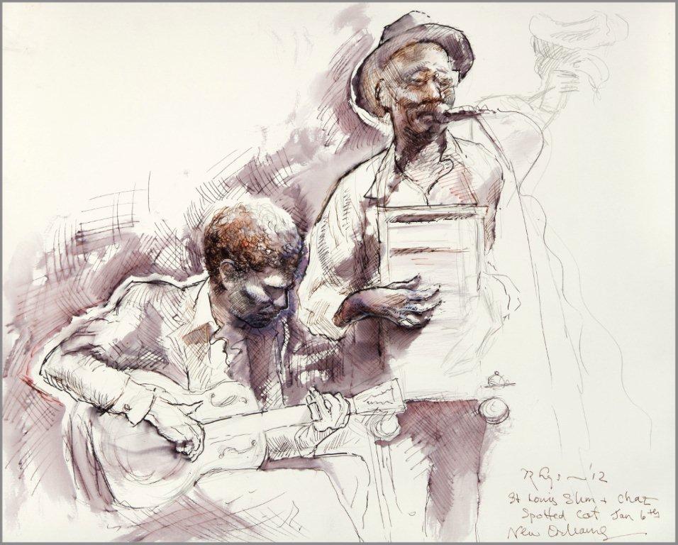 Emilie, a third-generation painter, is the daughter of Noel Rockmore (sometimes referred to as the Picasso of New Orleans). Rockmore is well known, for painting more than 800 portraits of the musicians of Preservation Jazz Hall. Emilie has been painting for more than 30 years, and now regularly sketches the musicians working in New Orleans today. She was always a painter first, but in the past two years, drawing has taken precedence and, happily, a sketchpad is well suited to the environment of music clubs.